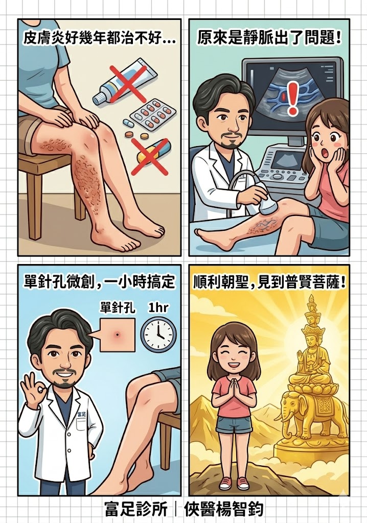 熱愛登山的50歲大哥,右腿靜脈曲張多年,腫脹的靜脈如纏繞的繩索,讓他走在山路上舉步維艱。擔心手術疼痛與長期恢復, 他一度放棄治療,甚至減少登山次數。經朋友推薦,接受楊智鈞醫師的「無刀微創靜脈曲張手術」。局部麻醉僅需一小時, 當天即可回家。術後,腿部恢復平滑,行走輕鬆。他再次穿上登山鞋,攀上山頂,享受大自然的自由與健康。!